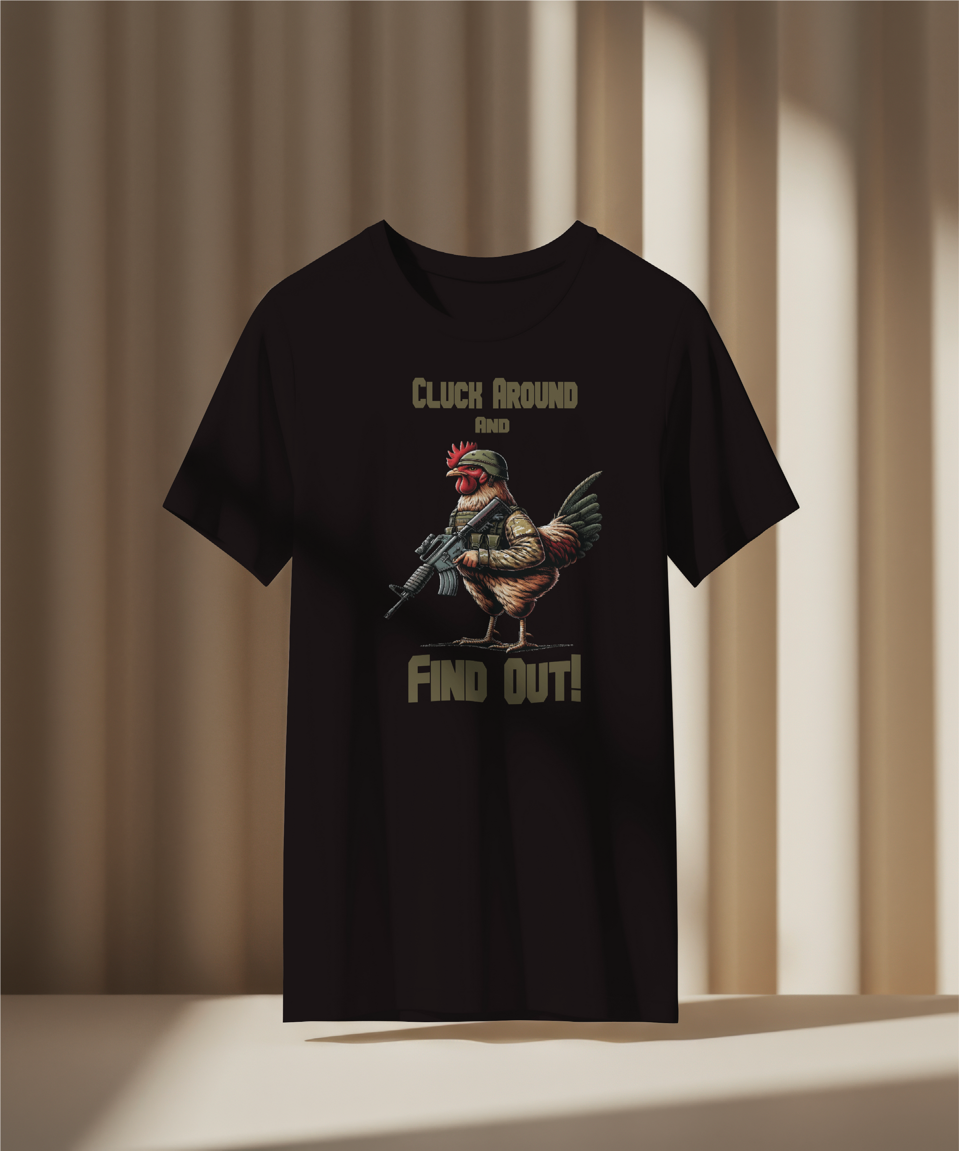 The Cluck Around T-shirt combines humor with comfort, featuring a playful "Cluck around and find out" design. Crafted from a polyester-cotton blend, it offers durability and a soft feel suitable for everyday wear. Available in sizes small through 3X, this shirt ensures a great fit for a wide range of customers seeking a lighthearted addition to their wardrobe.