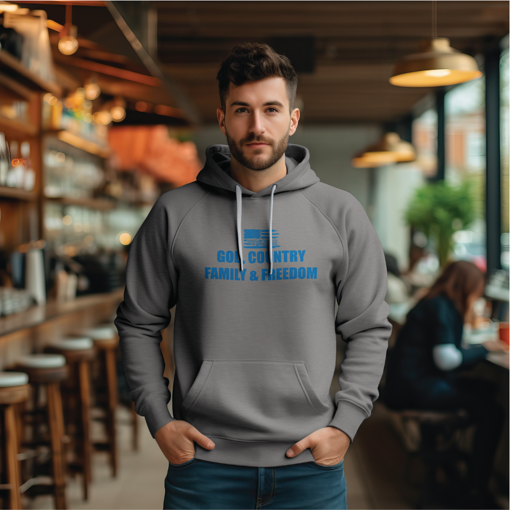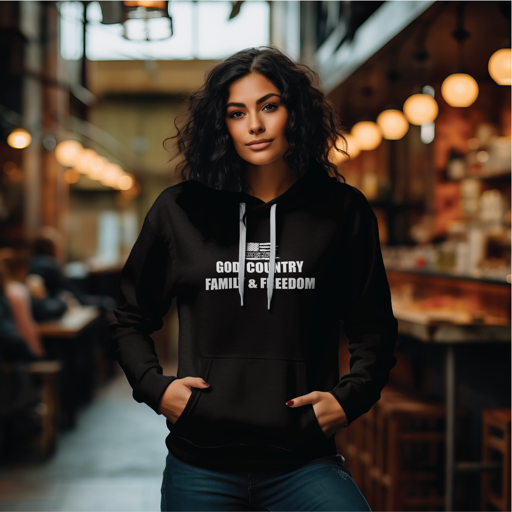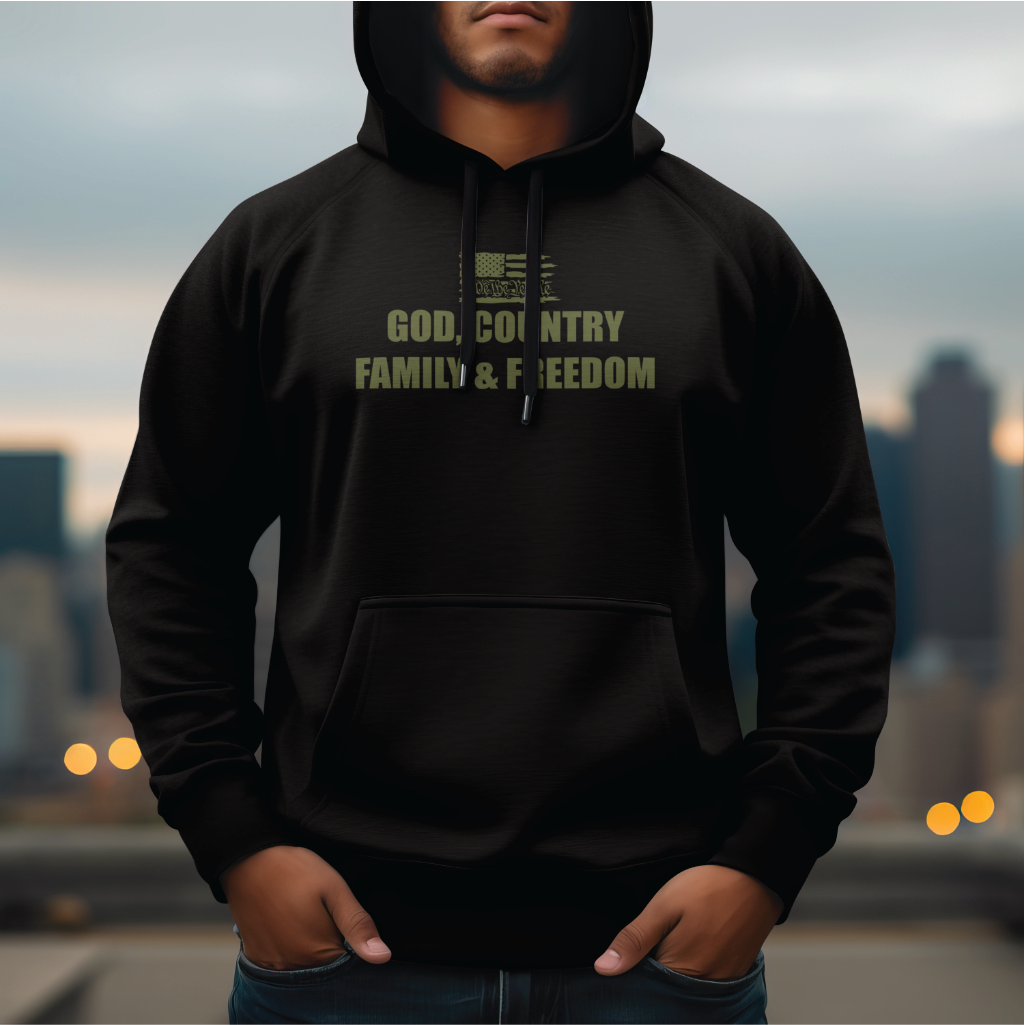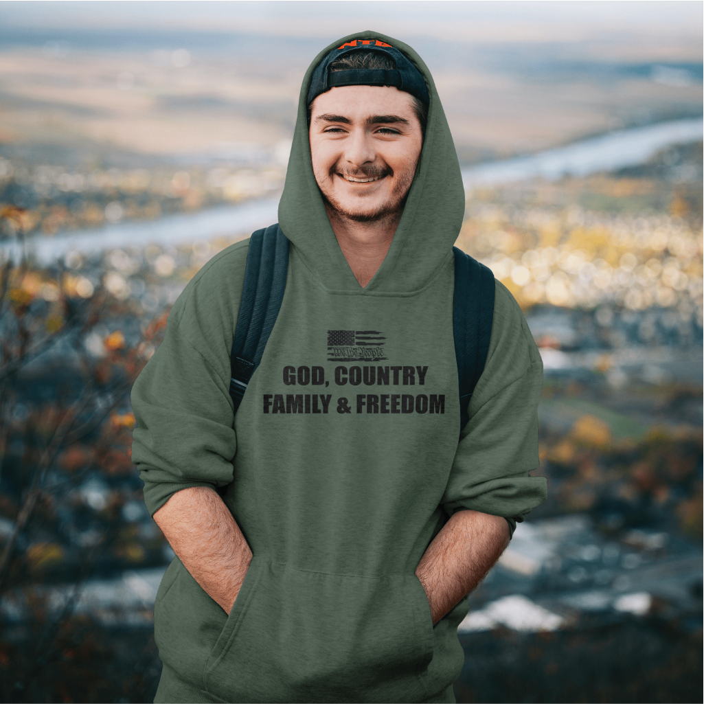 Experience comfort and durability with our God & Country Hoodie. Made from a polyester cotton blend, it won't shrink or fade. Show off your pride in God, Country, Family, and Freedom with this print, available in sizes small-3x. Print colors are black, blue, od green and white.