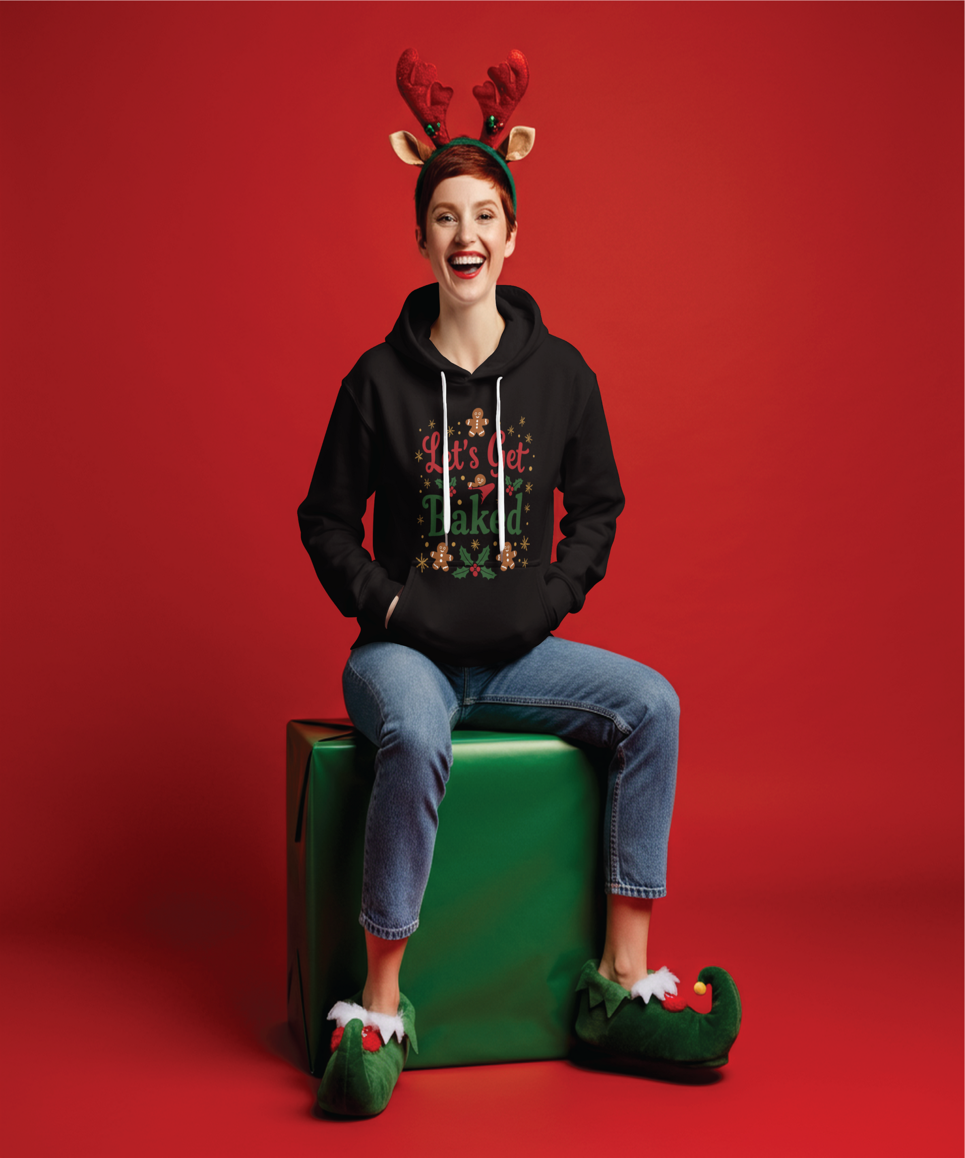 Embrace the holiday season with this playful "Let's Get Baked" hoodie that brings festive humor to your winter wardrobe. Crafted from a comfortable polyester-cotton blend, this cozy layer delivers warmth without sacrificing style. Available in sizes Small through 3X, it's designed to fit everyone in your crew. Perfect for holiday gatherings, ugly sweater parties, or casual seasonal wear, this hoodie captures Christmas spirit with a witty twist that'll get laughs wherever you go.