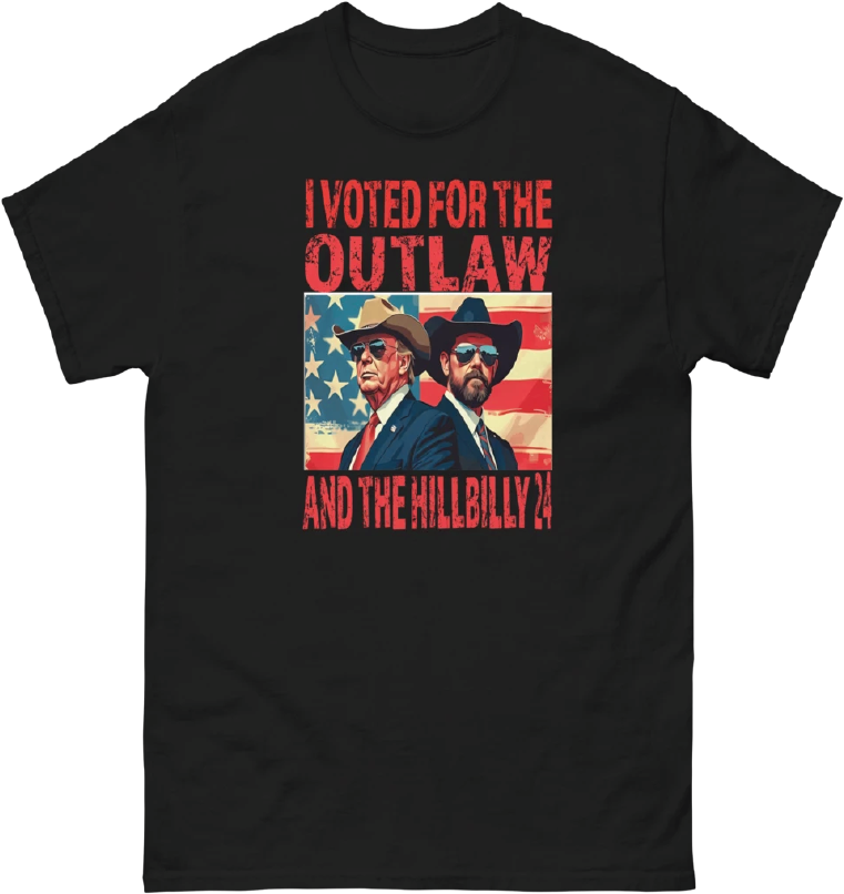 Show your support for this hardworking garbage man and 45/47th POTUS with our "Outlaw and Hillbilly" short sleeve shirt. Made with a comfortable polyester cotton blend, it comes in sizes small through 3x. Wear it to proudly display your vote.